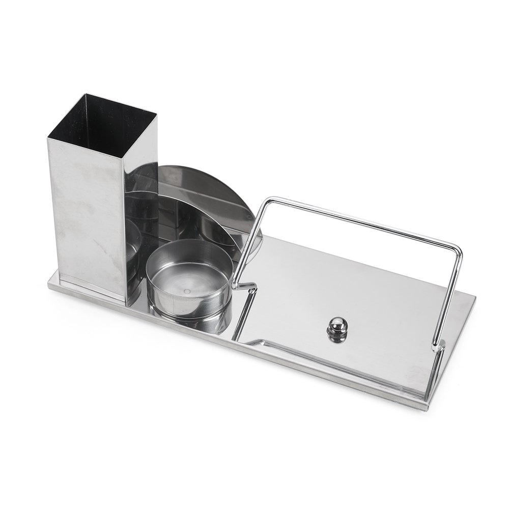 Kit escritório 4 em 1. Material inox espelhado, suporte para cartões, canetas, clips e celular.