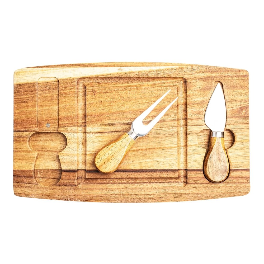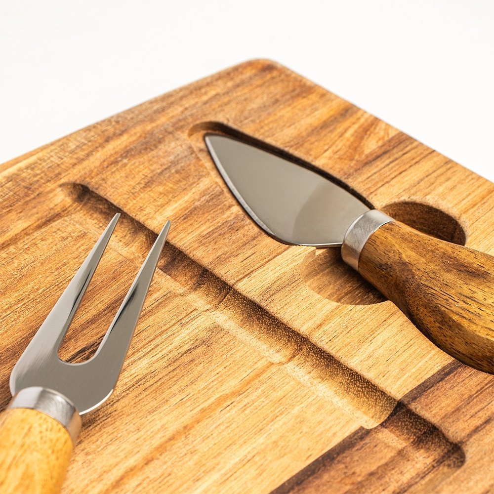 Kit queijo 3 peças, contém: tábua de madeira com canaleta, faca com ponta, e garfo. Tábua com imã para encaixe e fixação dos utensílios.