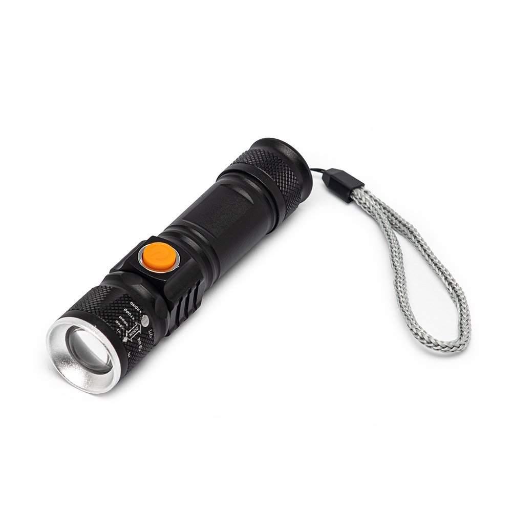 Lanterna led recarregável com zoom de regulagem e três estágios de iluminação, material metálico com USB acoplado para carregamento. Acompanha cordão de nylon.