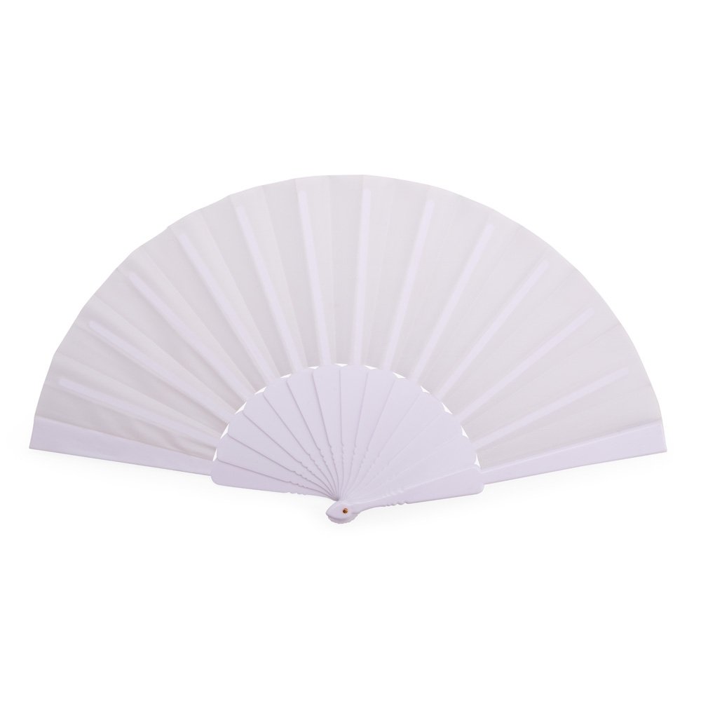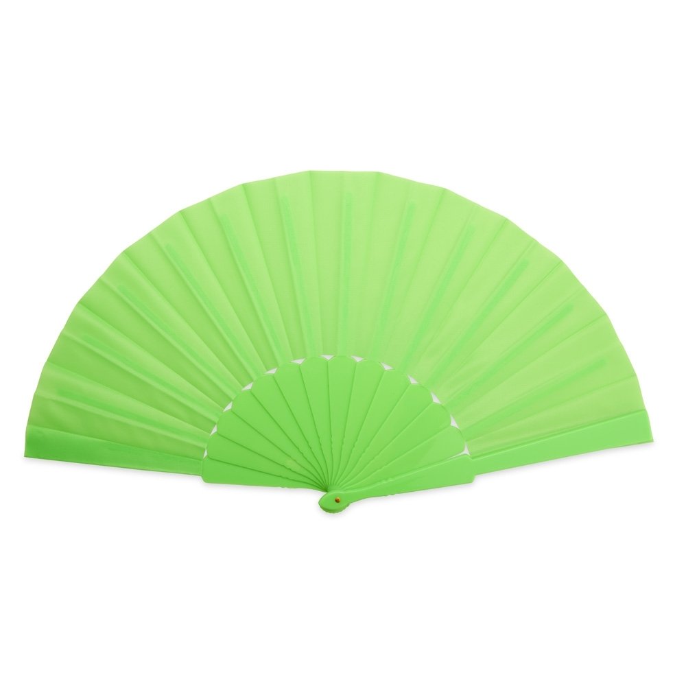 Leque com estrutura plástica compacta e tecido leve.
