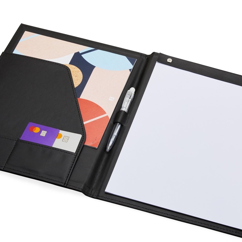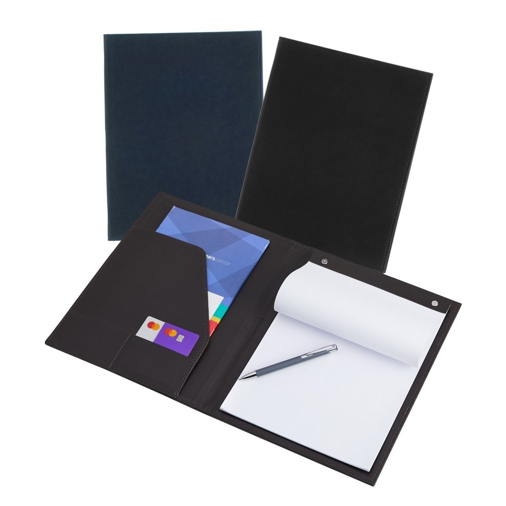Pasta convenção de couro sintético, possui porta caneta, compartimento para arquivar documentos, dois bolsos para cartões e um bloco com aproximadamente 25 folhas brancas não pautadas.