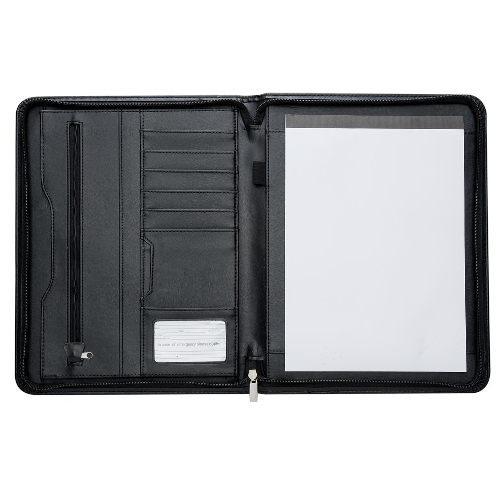 Pasta convenção de couro sintético com zíper, possui 2 compartimentos grandes para arquivar documentos, compartimento interno com zíper, 7 divisórias pequenas para documentos, suporte com visor para cartão de identificação, suporte para caneta(não acompanha caneta) e bloco com 20 folhas pautadas.