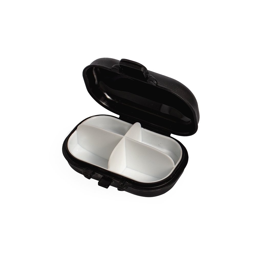 Porta-comprimidos feito em plástico. Possui compartimento removível com quatro divisórias, o que facilita a limpeza e ajuda a organizar medicamentos ou pequenos objetos.