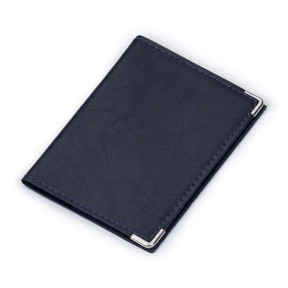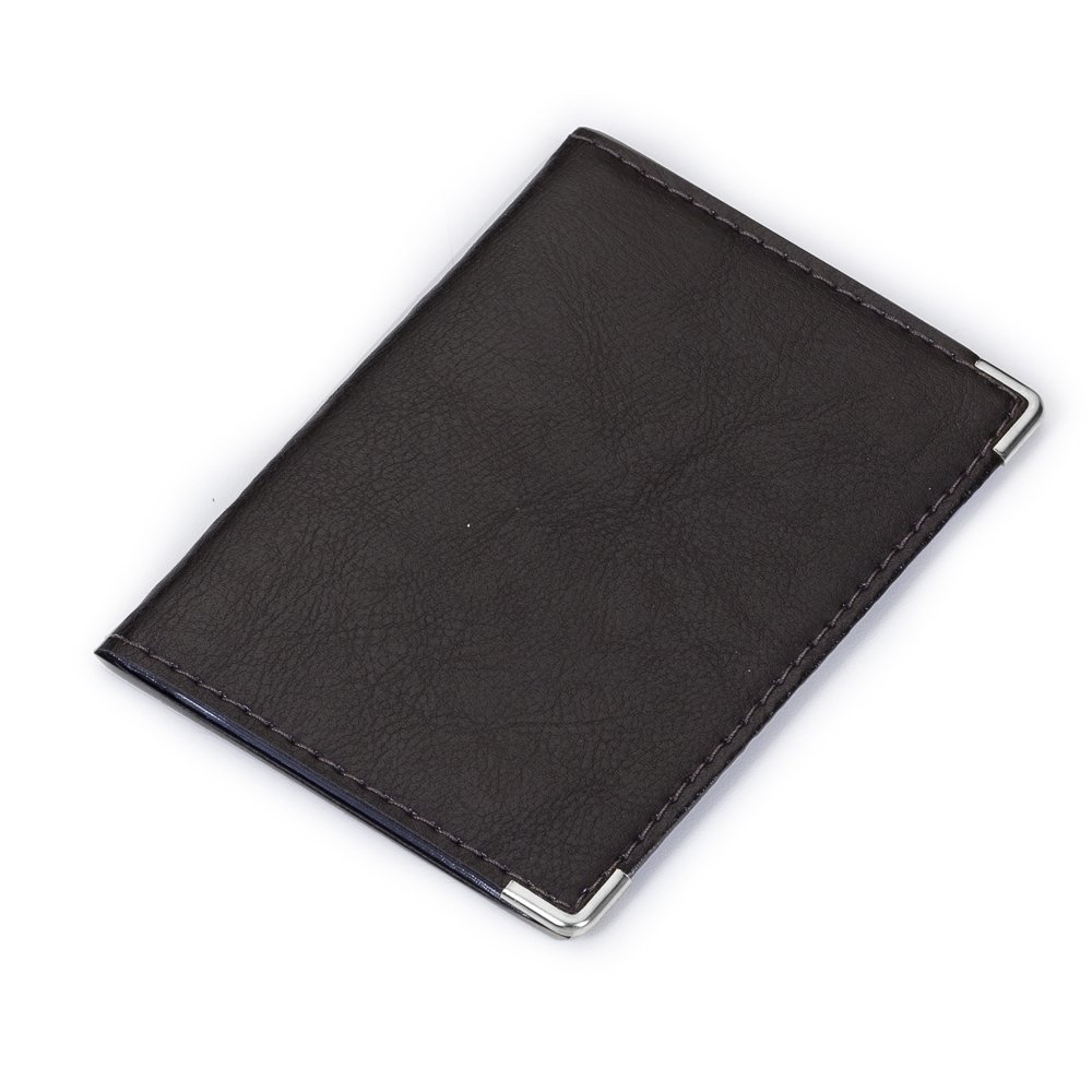 Porta-documento em couro sintético com cantoneira prata, possui 4 divisórias plásticas grande e duas divisórias pequenas.
