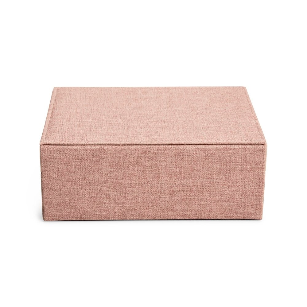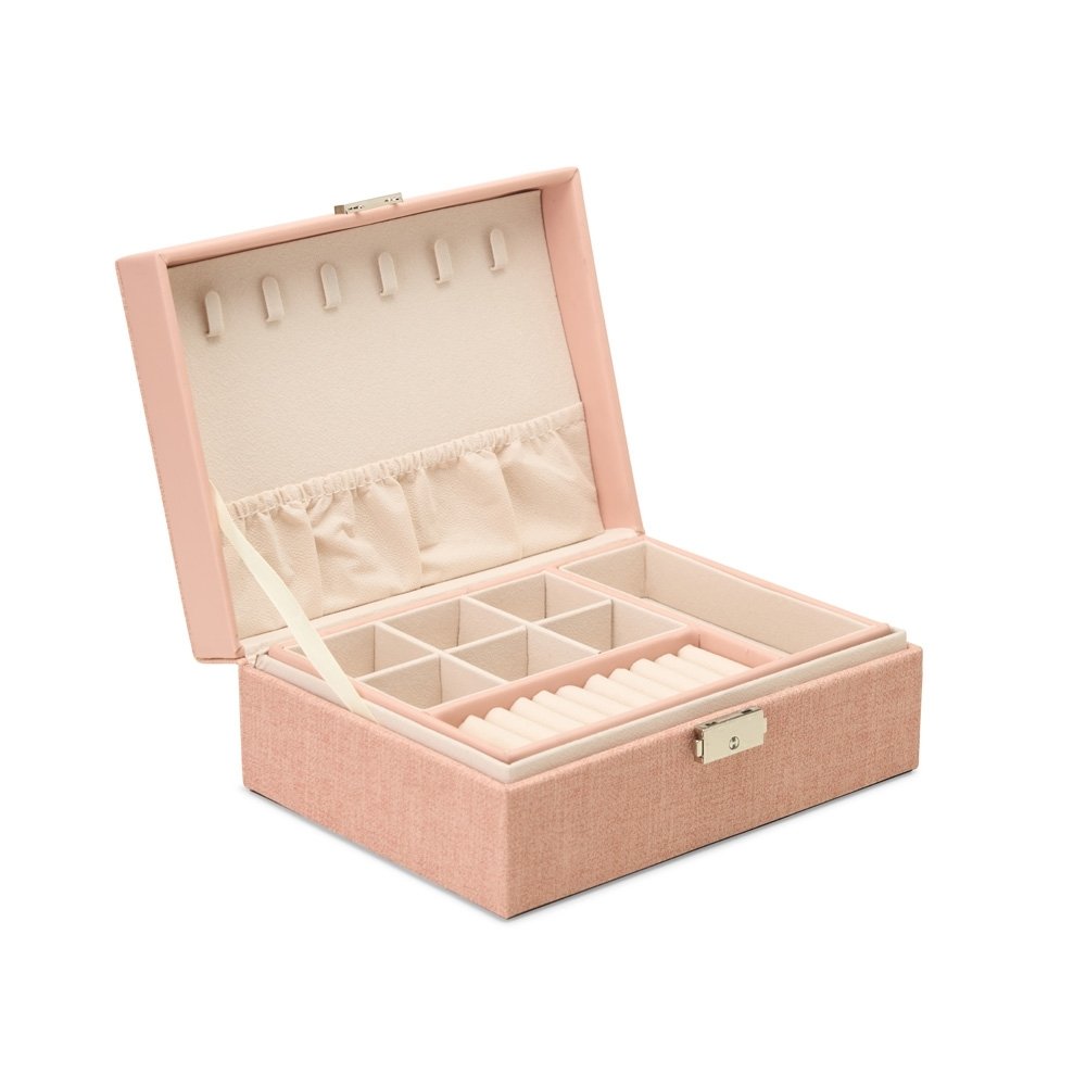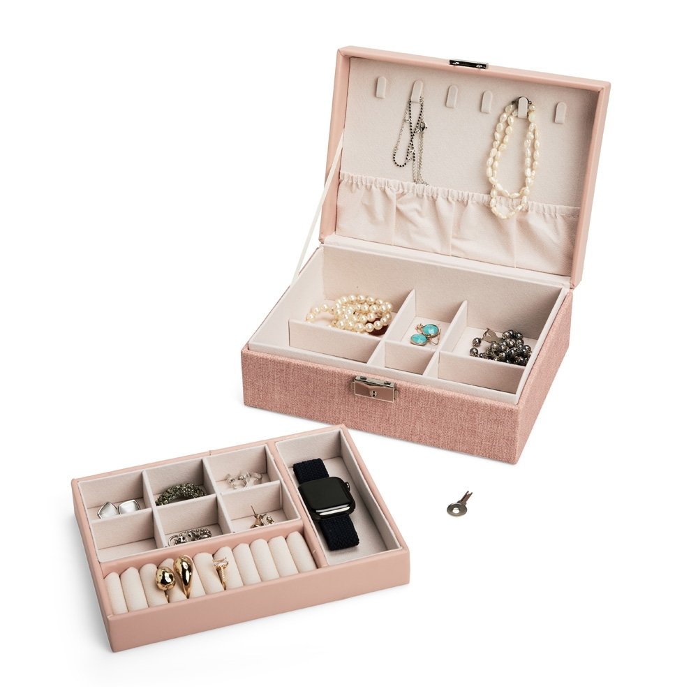 Porta-joias em Poliuretano e revestimento interno em tecido aveludado. Apresenta dois compartimentos principais com divisórias em diferentes tamanhos, incluindo uma repartição almofadada com ranhuras. Conta ainda com seis ganchos e um bolso com elástico na parte interna da tampa. O estojo possui trava de segurança e chave para fechamento.