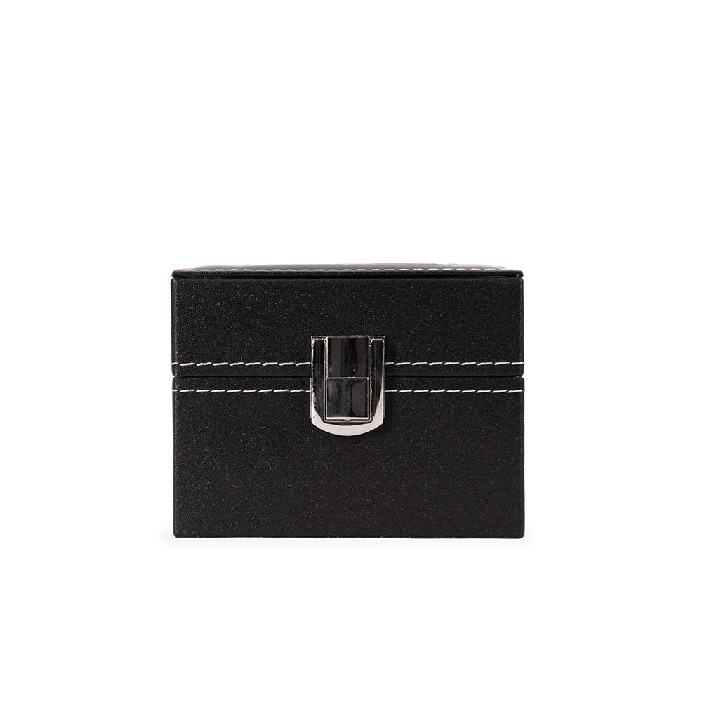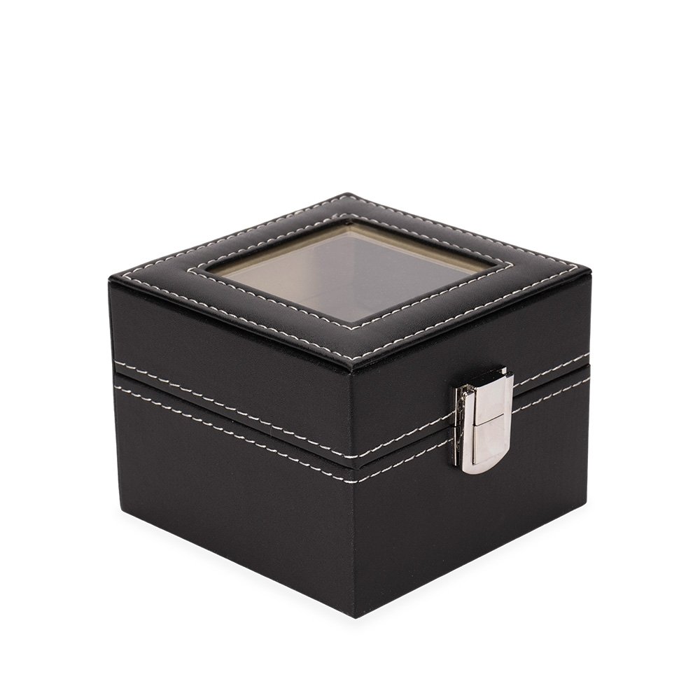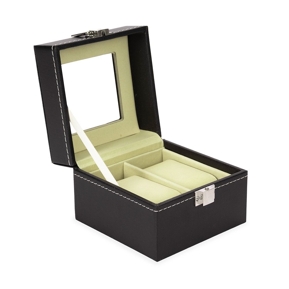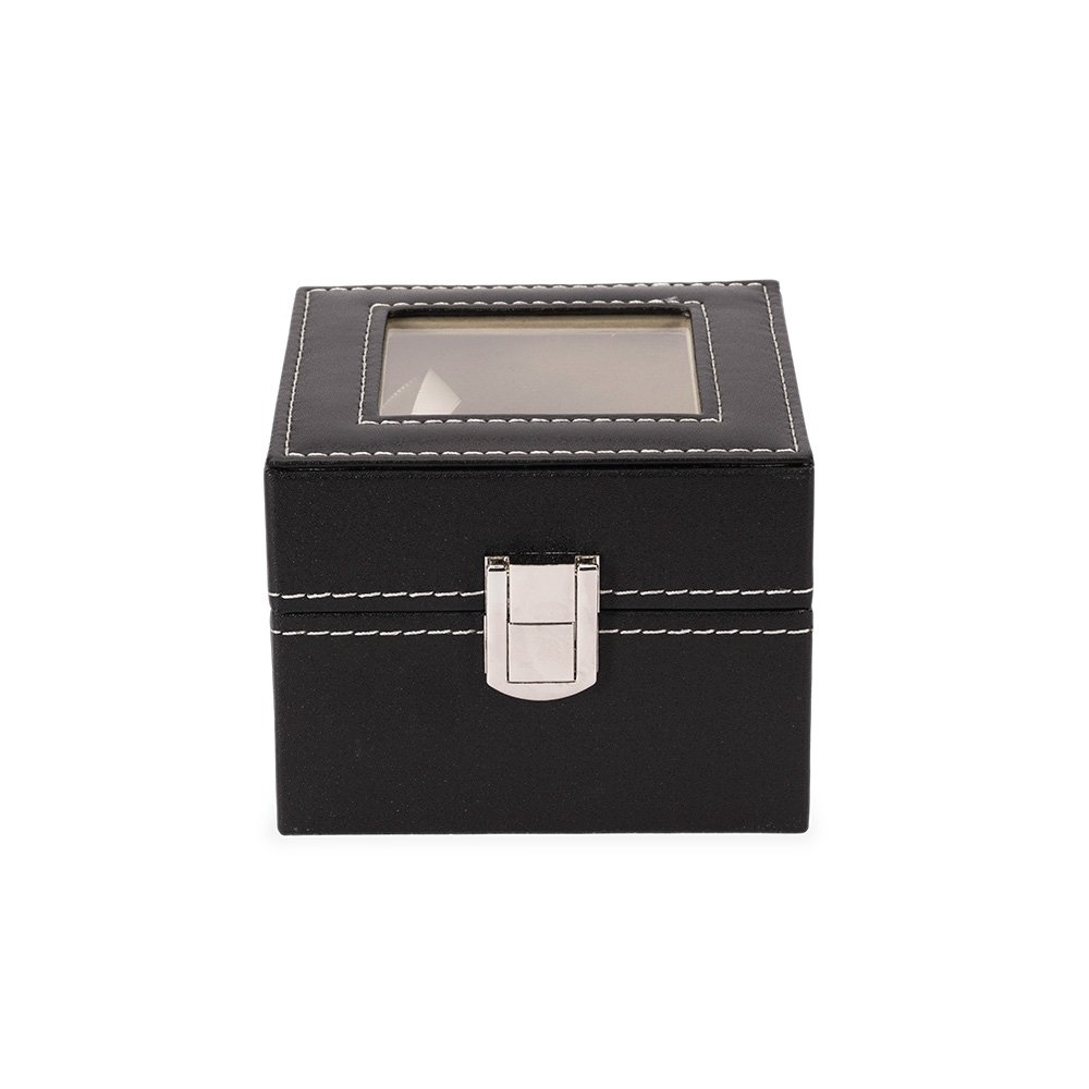 Porta-relógios com acabamento em couro sintético à base de PVC. Com revestimento interno de veludo, possui duas divisórias com almofadas removíveis, tampa com visor de vidro e trava de segurança para o fechamento do estojo.