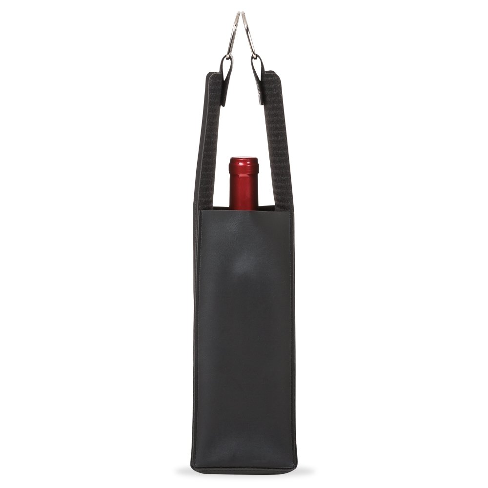 Estojo porta vinho em couro sintético bidim, contém duas alças metálicas e botão para lacre.