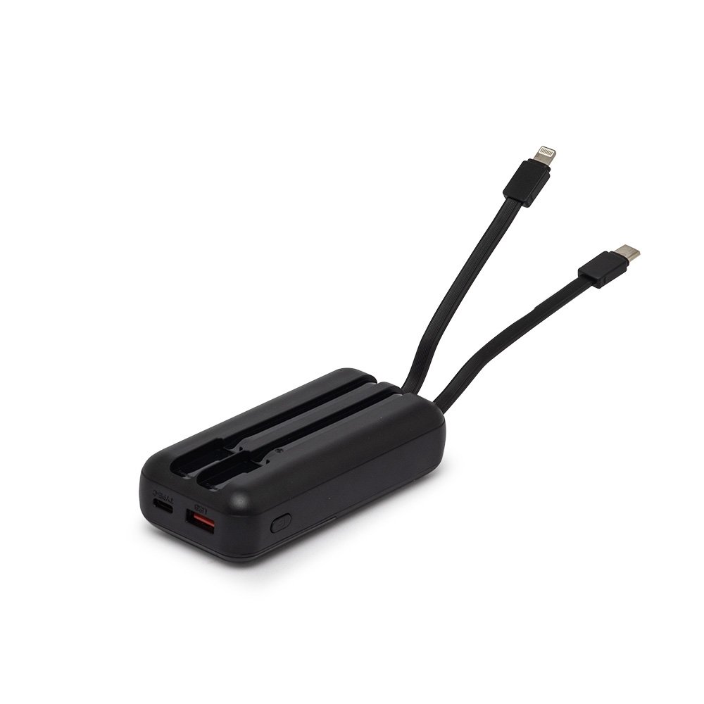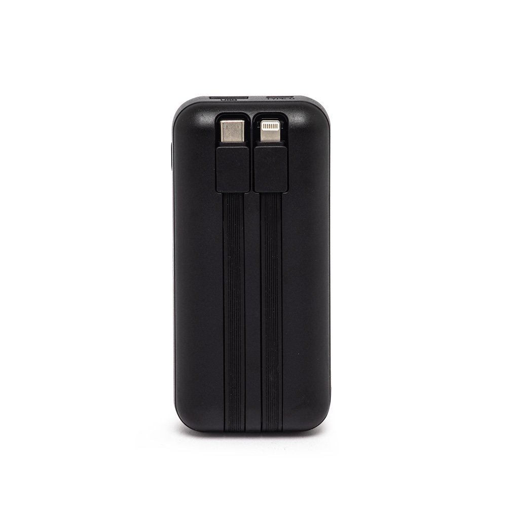 Carregador portátil plástico com 6.000mAh, com duas saídas, tipo C e lightning, display com indicador de bateria. Possui entrada tipo C e USB. Acompanha cabo tipo C.