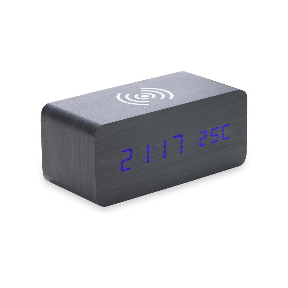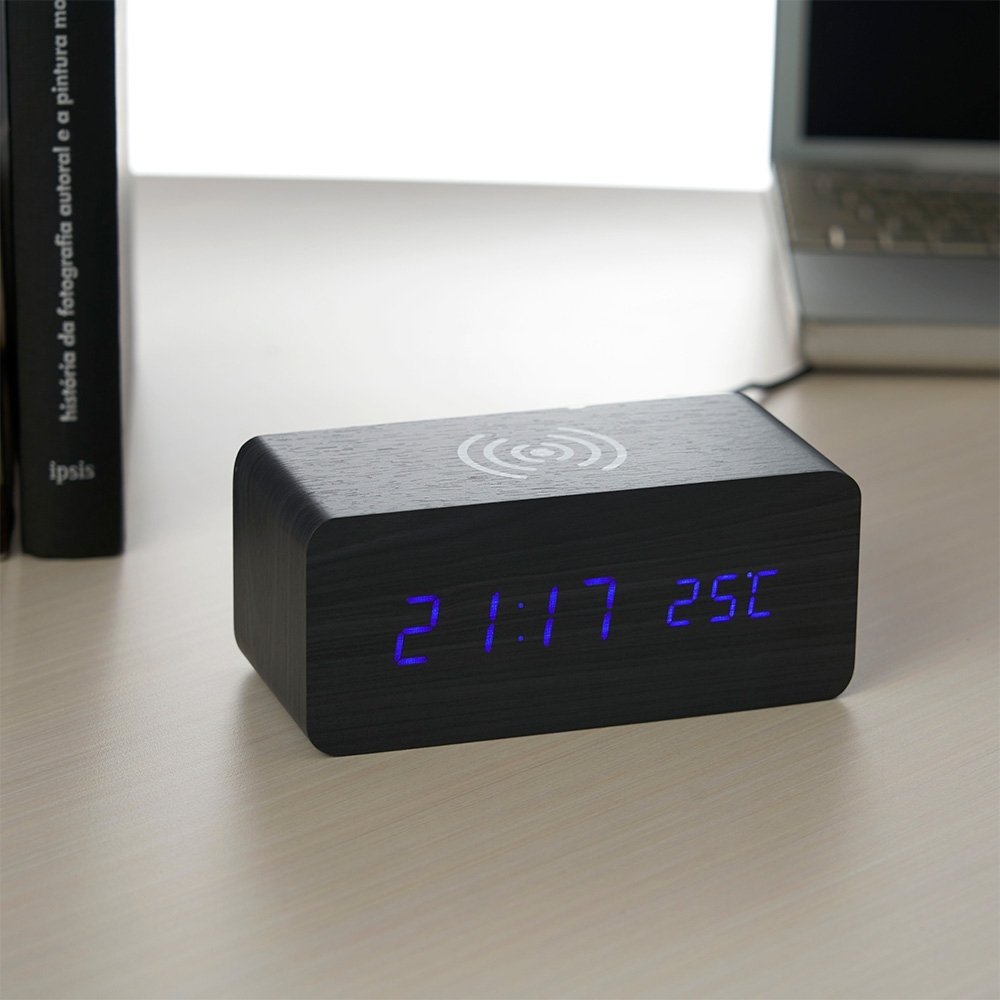Estilo e praticidade na hora certa! O nosso Relógio digital LED possui alarme, medidor de temperatura e carregamento por indução, carregando smartphones e outros dispositivos compatíveis de forma rápida e fácil, sem a necessidade de fios. Totalmente produzido em MDF, com um display em LED, parte traseira com mecanismo para ajustes, entrada DC 5V e compartimento de pilhas. Podendo ser utilizado através da fonte USB (acompanha) ou 3 pilhas AAA (não acompanha) como modo emergencial.