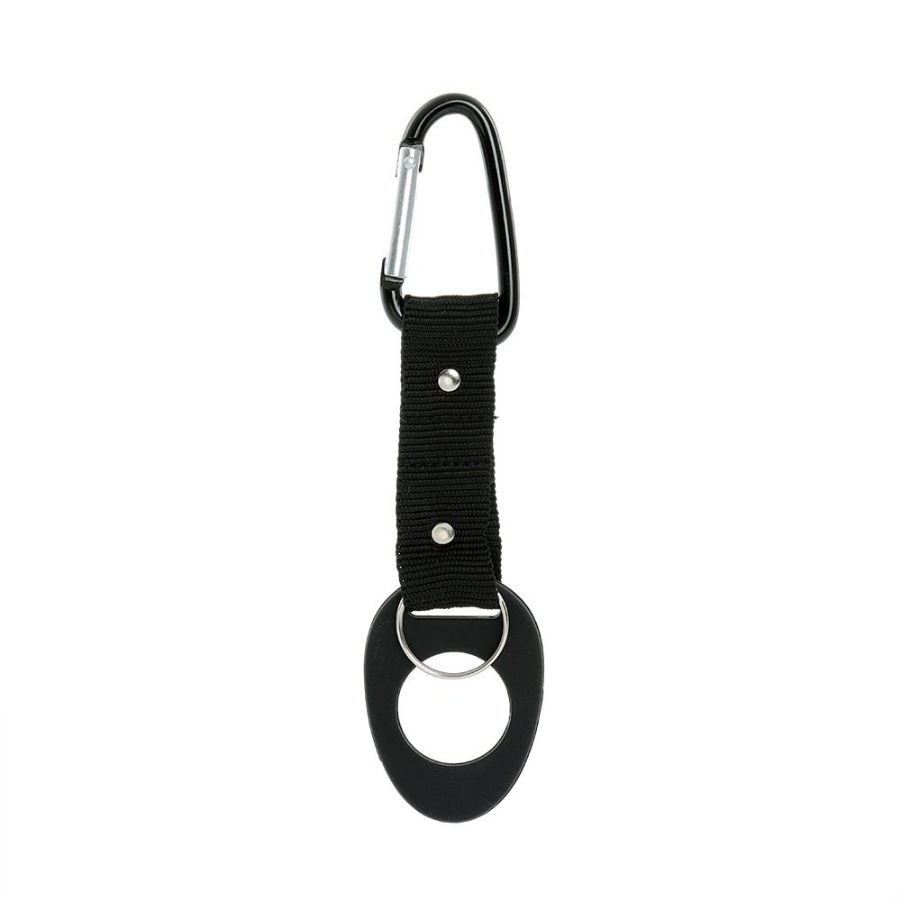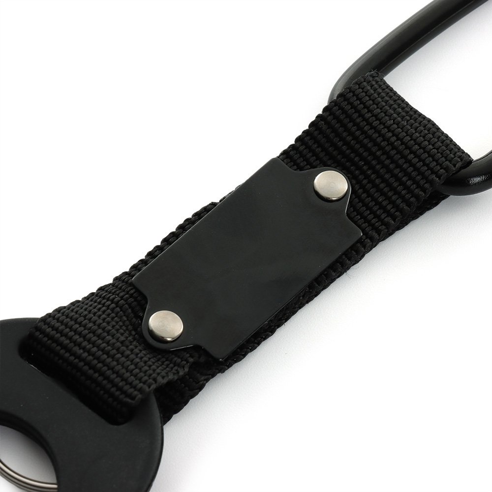 Suporte formado por uma alça de nylon ligada a um anel maleável, próprio para encaixe em bocais de garrafas PET. Em uma ponta, conta com o anel, e na outra, com mosquetão e argola para chaveiro.